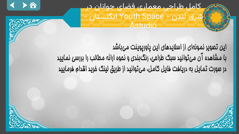پاورپوینت کامل طراحی معماری فضای جوانان در شرق لندن Youth Space – انگلستان – Astudio