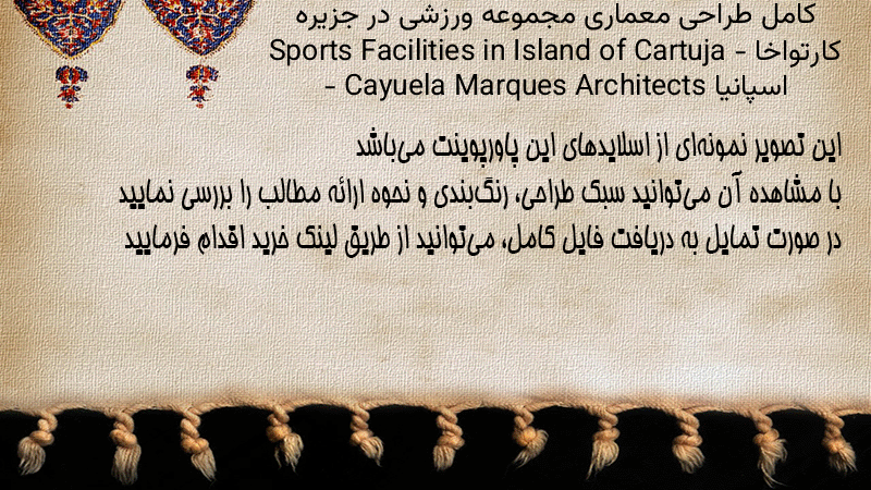 پاورپوینت کامل طراحی معماری مجموعه ورزشی در جزیره کارتواخا Sports Facilities in Island of Cartuja – اسپانیا – Cayuela Marques Architects