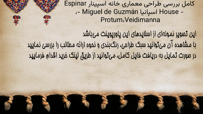 پاورپوینت کامل بررسی طراحی معماری خانه اسپینار Espinar House – اسپانیا – Miguel de Guzmán، Veidimanna، Protum