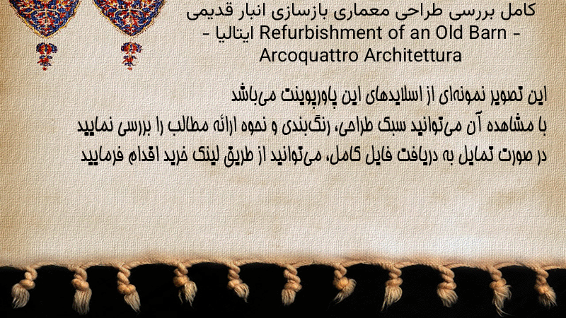 پاورپوینت کامل بررسی طراحی معماری بازسازی انبار قدیمی Refurbishment of an Old Barn – ایتالیا – Arcoquattro Architettura