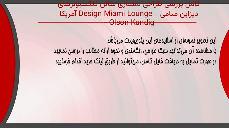 پاورپوینت کامل بررسی طراحی معماری سالن کلکسیونرهای دیزاین میامی Design Miami Lounge – آمریکا – Olson Kundig