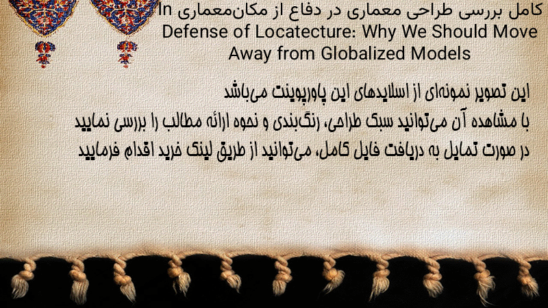 پاورپوینت کامل بررسی طراحی معماری در دفاع از مکانمعماری In Defense of Locatecture: Why We Should Move Away from Globalized Models