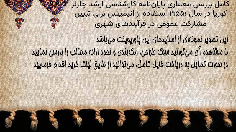 پاورپوینت کامل بررسی معماری پایاننامه کارشناسی ارشد چارلز کوریا در سال ۱۹۵۵؛ استفاده از انیمیشن برای تبیین مشارکت عمومی در فرآیندهای شهری
