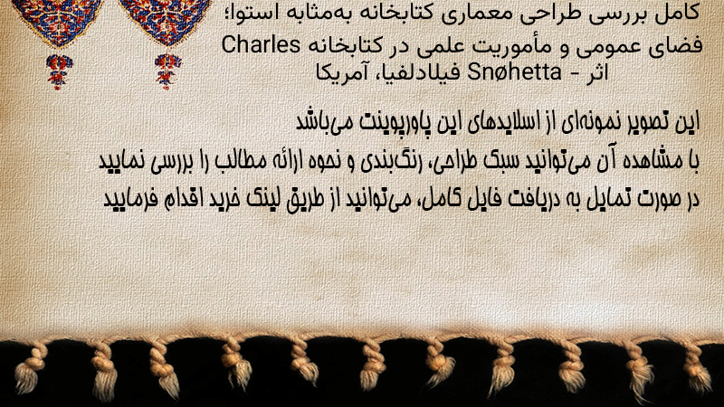 پاورپوینت کامل بررسی طراحی معماری کتابخانه بهمثابه استوا؛ فضای عمومی و مأموریت علمی در کتابخانه Charles اثر Snøhetta – فیلادلفیا، آمریکا