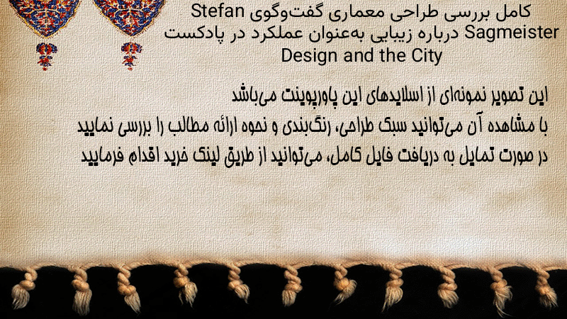 پاورپوینت کامل بررسی طراحی معماری گفتوگوی Stefan Sagmeister درباره زیبایی بهعنوان عملکرد در پادکست Design and the City