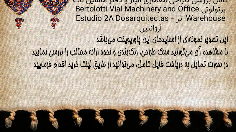 پاورپوینت کامل بررسی طراحی معماری انبار و دفتر ماشینآلات برتولوتی Bertolotti Vial Machinery and Office Warehouse اثر Estudio 2A Dosarquitectas – آرژانتین