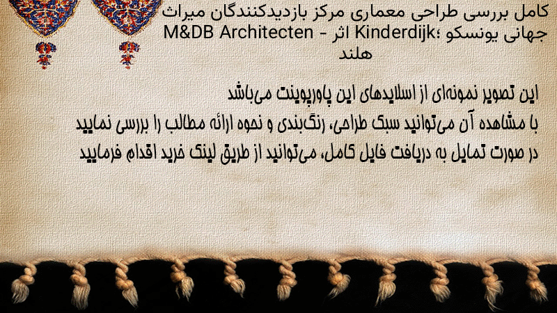 پاورپوینت کامل بررسی طراحی معماری مرکز بازدیدکنندگان میراث جهانی یونسکو Kinderdijk؛ اثر M&DB Architecten – هلند