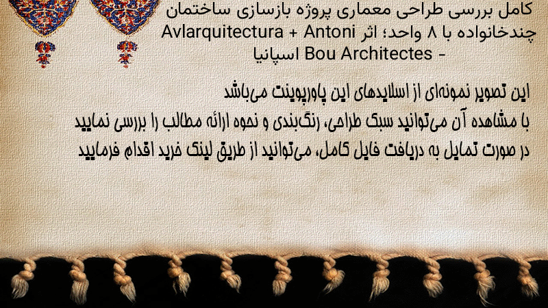 پاورپوینت کامل بررسی طراحی معماری پروژه بازسازی ساختمان چندخانواده با ۸ واحد؛ اثر Avlarquitectura + Antoni Bou Architectes – اسپانیا