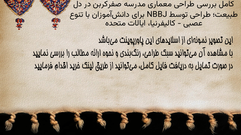 پاورپوینت کامل بررسی طراحی معماری مدرسه صفرکربن در دل طبیعت؛ طراحی توسط NBBJ برای دانشآموزان با تنوع عصبی – کالیفرنیا، ایالات متحده
