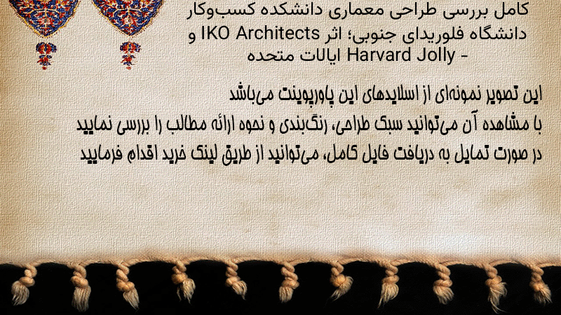 پاورپوینت کامل بررسی طراحی معماری دانشکده کسبوکار دانشگاه فلوریدای جنوبی؛ اثر IKO Architects و Harvard Jolly – ایالات متحده