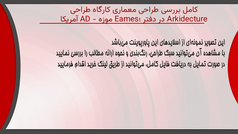پاورپوینت کامل بررسی طراحی معماری کارگاه طراحی Arkidecture در دفتر Eames؛ موزه AD – آمریکا