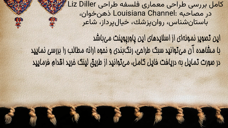 پاورپوینت کامل بررسی طراحی معماری فلسفه طراحی Liz Diller در مصاحبه Louisiana Channel: ذهنخوان، باستانشناس، روانپزشک، خیالپرداز، شاعر