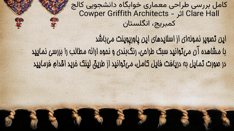 پاورپوینت کامل بررسی طراحی معماری خوابگاه دانشجویی کالج Clare Hall اثر Cowper Griffith Architects – کمبریج، انگلستان