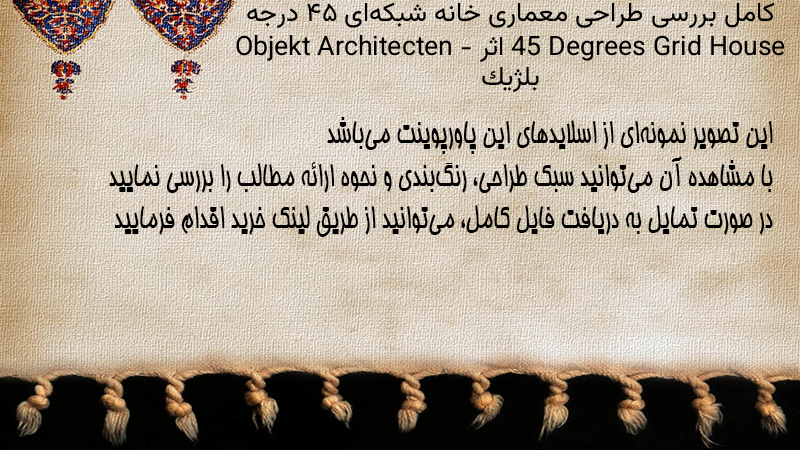 پاورپوینت کامل بررسی طراحی معماری خانه شبکهای ۴۵ درجه ۴۵ Degrees Grid House اثر Objekt Architecten – بلژیک