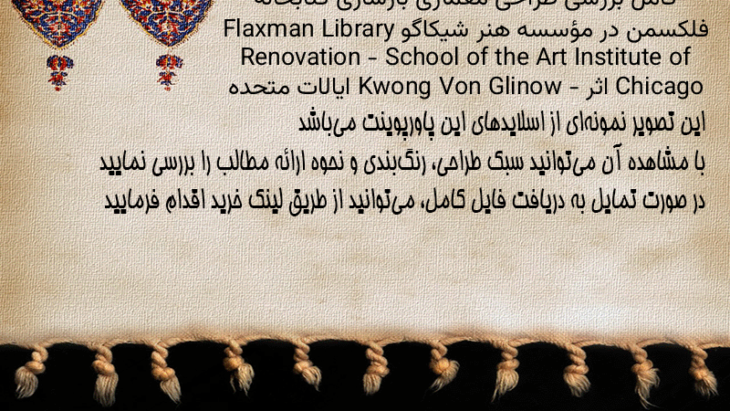پاورپوینت کامل بررسی طراحی معماری بازسازی کتابخانه فلکسمن در مؤسسه هنر شیکاگو Flaxman Library Renovation – School of the Art Institute of Chicago اثر Kwong Von Glinow – ایالات متحده