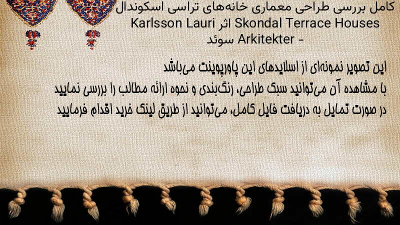 پاورپوینت کامل بررسی طراحی معماری خانههای تراسی اسکوندال Skondal Terrace Houses اثر Karlsson Lauri Arkitekter – سوئد