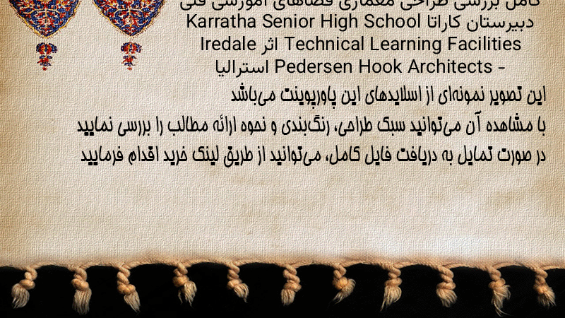پاورپوینت کامل بررسی طراحی معماری فضاهای آموزشی فنی دبیرستان کاراتا Karratha Senior High School Technical Learning Facilities اثر Iredale Pedersen Hook Architects – استرالیا