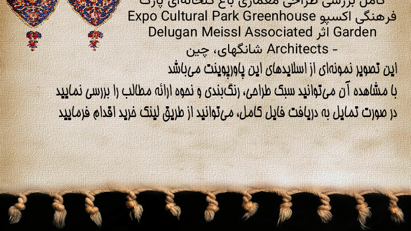 پاورپوینت کامل بررسی طراحی معماری باغ گلخانهای پارک فرهنگی اکسپو Expo Cultural Park Greenhouse Garden اثر Delugan Meissl Associated Architects – شانگهای، چین