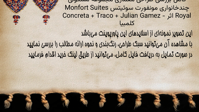 پاورپوینت کامل بررسی طراحی معماری مجموعه مسکونی چندخانواری مونفورت سوئیتس Monfort Suites Royal اثر Concreta + Traco + Julian Gamez – کلمبیا