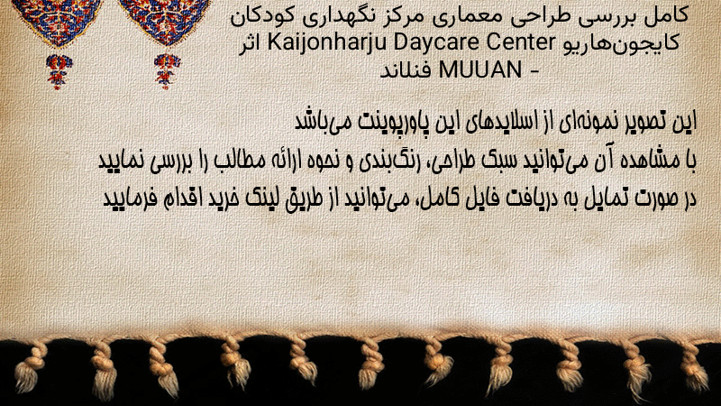 پاورپوینت کامل بررسی طراحی معماری مرکز نگهداری کودکان کایجونهاریو Kaijonharju Daycare Center اثر MUUAN – فنلاند