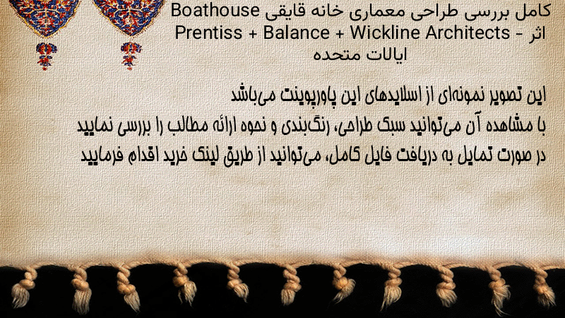 پاورپوینت کامل بررسی طراحی معماری خانه قایقی Boathouse اثر Prentiss + Balance + Wickline Architects – ایالات متحده
