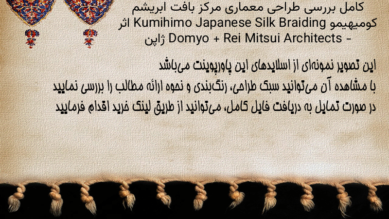 پاورپوینت کامل بررسی طراحی معماری مرکز بافت ابریشم کومیهیمو Kumihimo Japanese Silk Braiding اثر Domyo + Rei Mitsui Architects – ژاپن