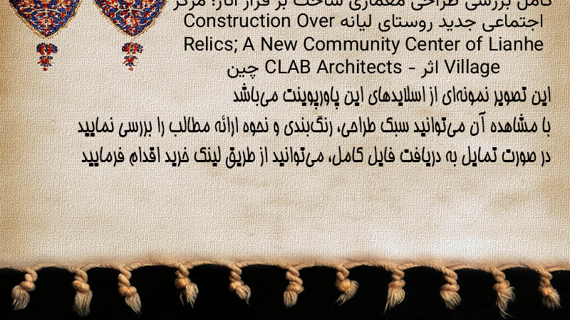 پاورپوینت کامل بررسی طراحی معماری ساخت بر فراز آثار؛ مرکز اجتماعی جدید روستای لیانه Construction Over Relics; A New Community Center of Lianhe Village اثر CLAB Architects – چین