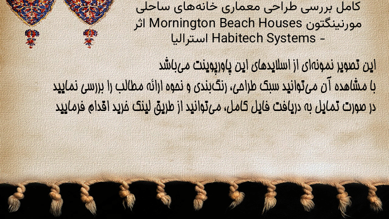 پاورپوینت کامل بررسی طراحی معماری خانههای ساحلی مورنینگتون Mornington Beach Houses اثر Habitech Systems – استرالیا