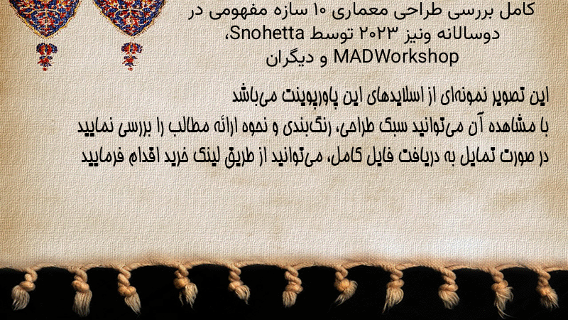 پاورپوینت کامل بررسی طراحی معماری ۱۰ سازه مفهومی در دوسالانه ونیز ۲۰۲۳ توسط Snohetta، MADWorkshop و دیگران