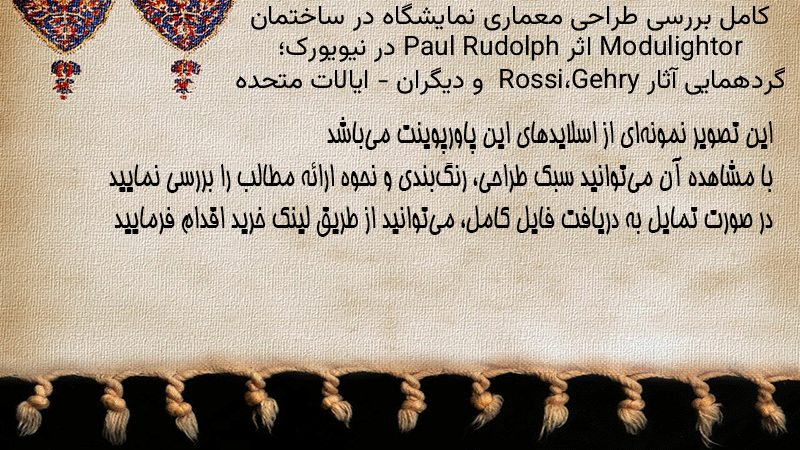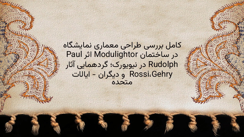 پاورپوینت کامل بررسی طراحی معماری نمایشگاه در ساختمان Modulightor اثر Paul Rudolph در نیویورک؛ گردهمایی آثار Gehry، Rossi و دیگران – ایالات متحده